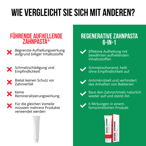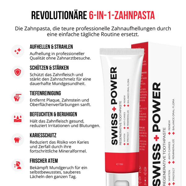 Die Swiss+Power Regenerative Zahnpasta ist eine professionelle 6-in-1-Formel, die weit über die reine Reinigung hinausgeht. Sie hellt die Zähne auf, stärkt den Zahnschmelz, beruhigt das Zahnfleisch, reduziert Plaque, beugt Karies vor und sorgt für frischen Atem – alles in einem Produkt.