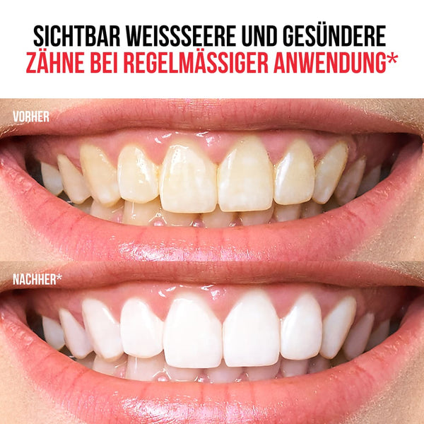 - Aufhellend – Entfernt sicher Verfärbungen und hellt die Zähne für ein strahlendes Lächeln auf.