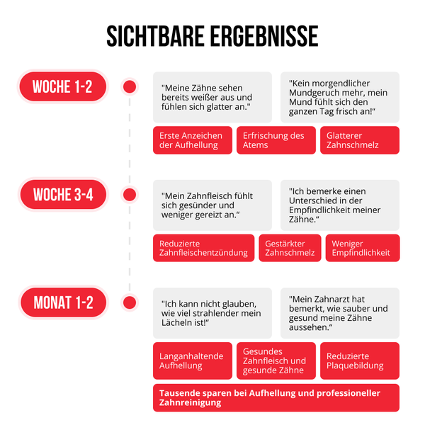 Viele Anwender bemerken bereits nach 1–2 Wochen ein saubereres, helleres Lächeln. Bei regelmäßiger Anwendung werden mit der Zeit ein stärkerer Zahnschmelz und ein angenehmeres Zahnfleischgefühl festgestellt.