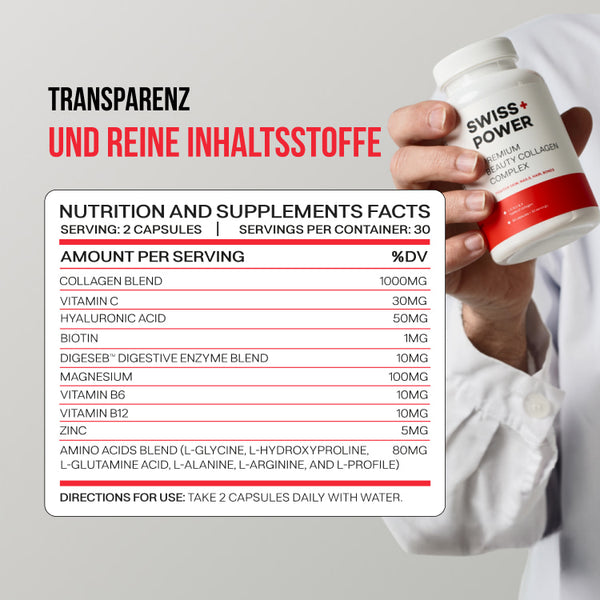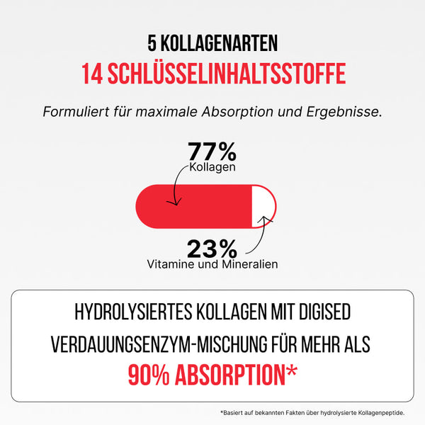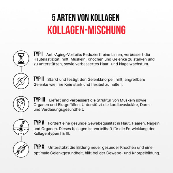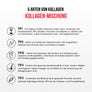 - Besteht aus 5 Arten von hydrolysiertem Kollagen (Typ I, II, III, V und X).